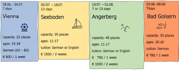 Le 3 sedi dei corsi offrono numerose possibilità di ricreazione nelle regioni più belle dell'Austria. Si offrono gite a Salisburgo e Vienna, visite speleologiche e in fattoria.